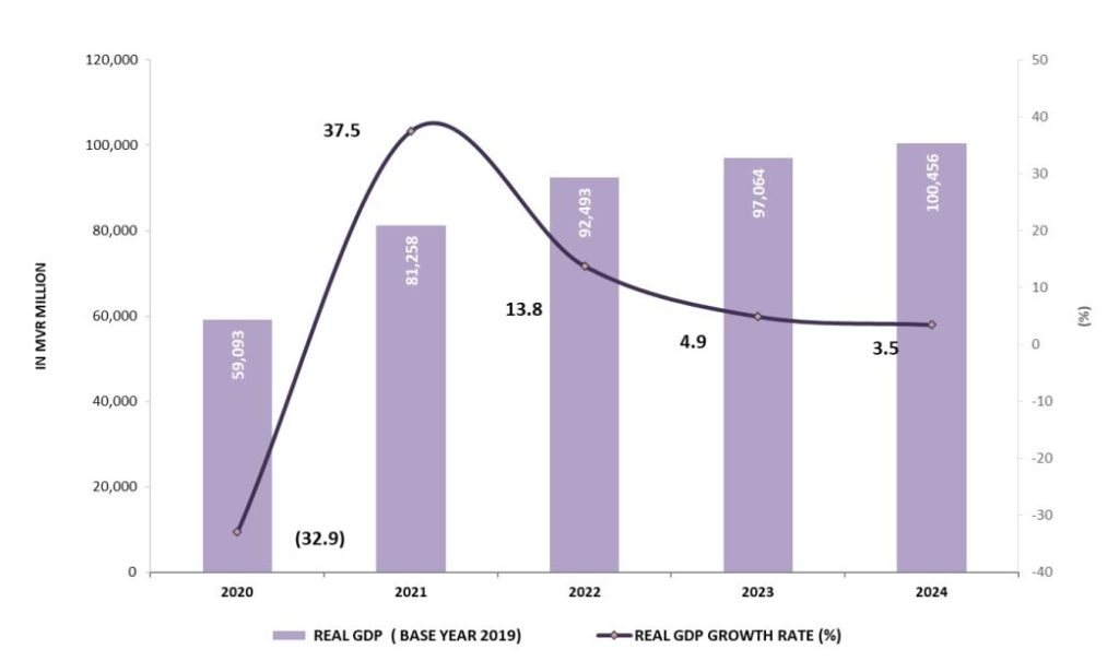 In 2020, the Maldives was among the countries most impacted by the Covid-19 pandemic due to its reliance on tourism. Albeit the economic slowdown that followed, the Maldivian economy observed a robust recovery in 2021 with a staggering 32% expansion in economic output. Despite the closing of key markets, the Maldivian tourism sector managed to diversify its source markets and maintain the momentum in the following years.